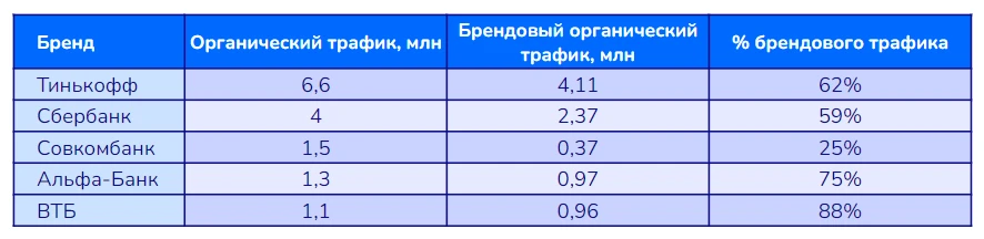 Этот метод идеален для компаний, которые имеют значительное влияние на рынок. Каждый пресс-релиз об изменениях в организации, кейс или аналитический материал может содержать встроенные ссылки. Подобные публикации решают и другие важные задачи: повышают вашу экспертность и узнаваемость, что, в свою очередь, увеличивает объем брендового трафика из поисковой выдачи. Согласно результатам исследования Sape, объем такого трафика у лидеров финансового рынка очень велик и доходит до 88%: