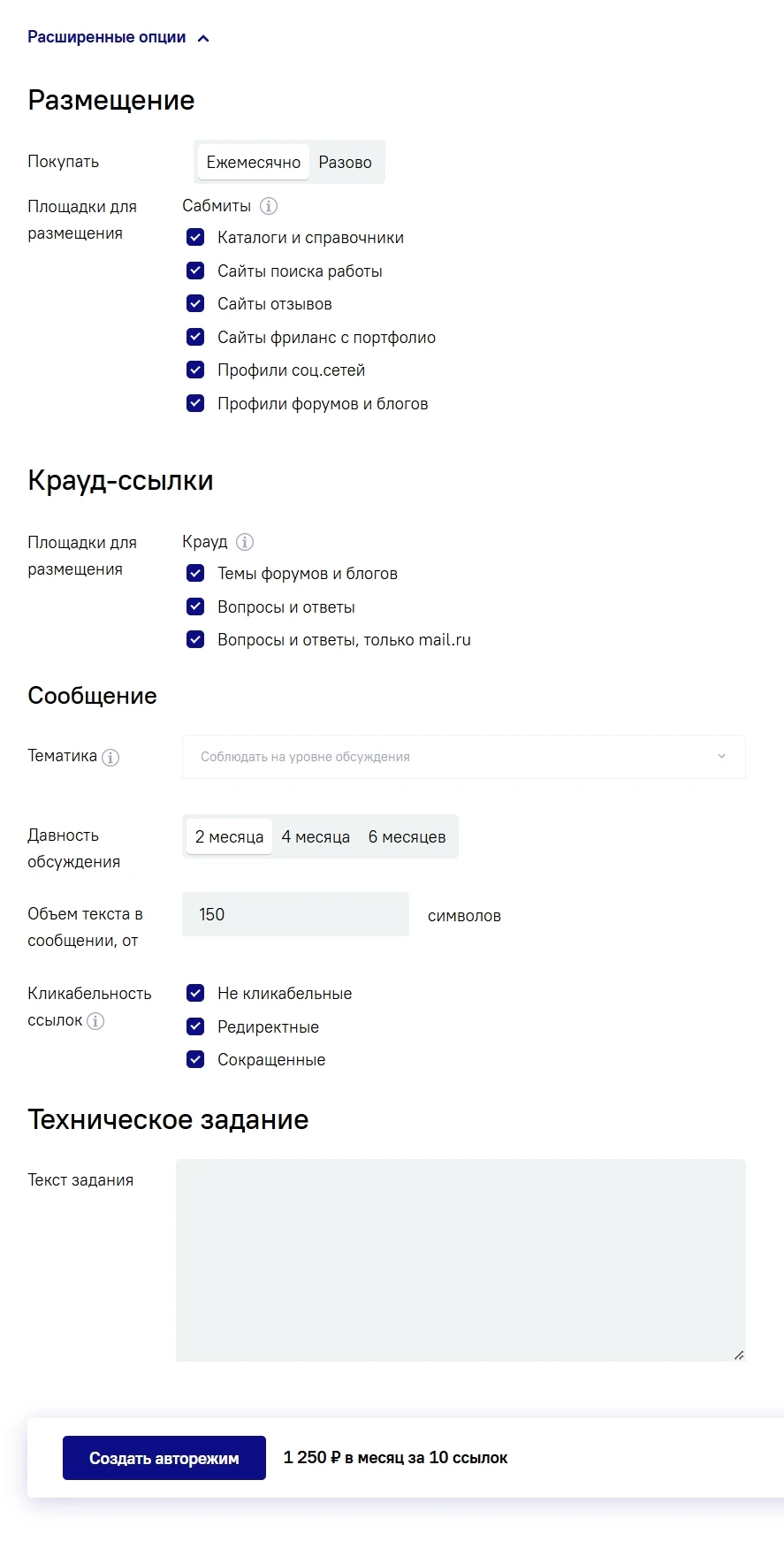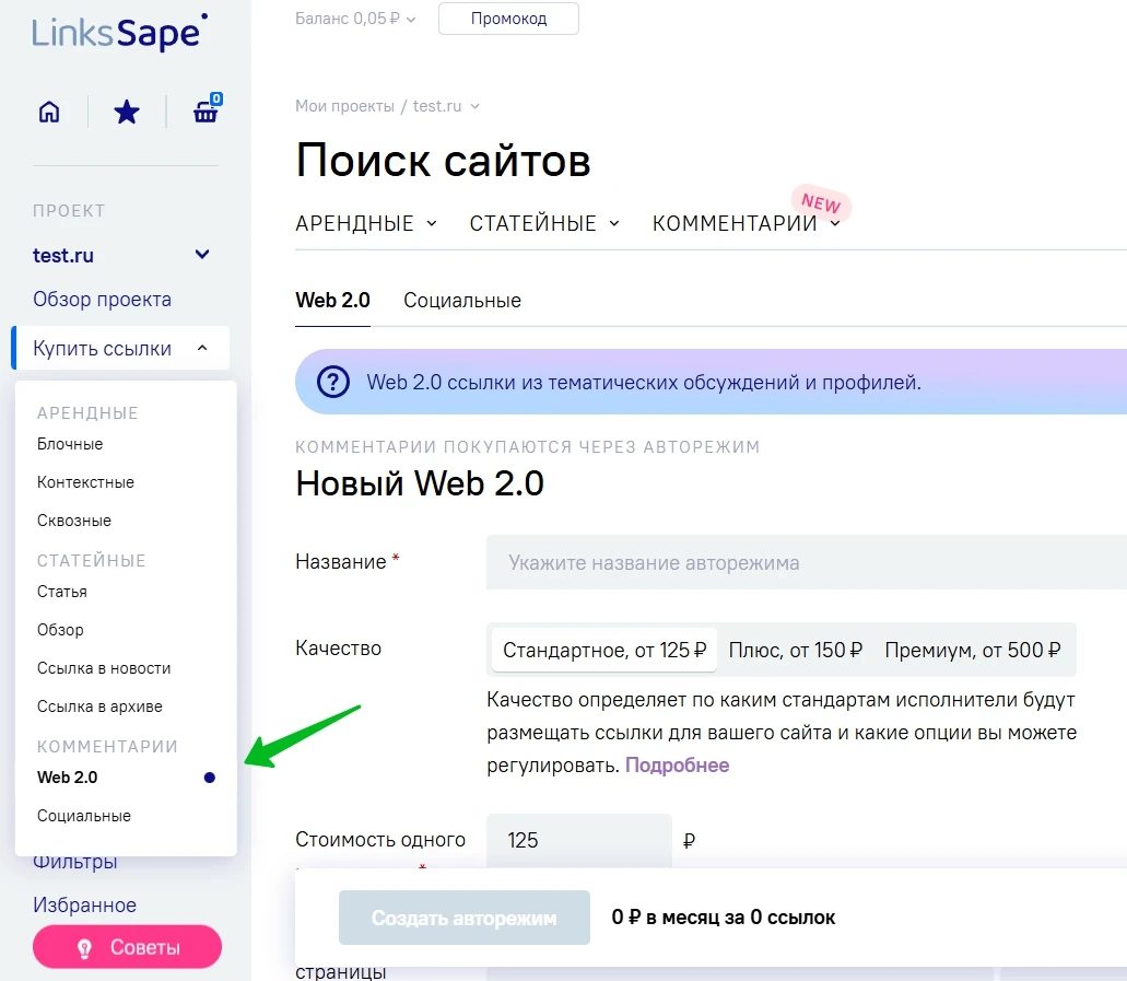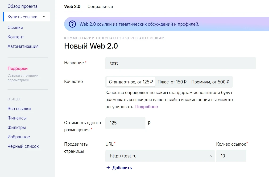 Выберите тип ссылок: Web 2.0 (размещение в тематических обсуждениях и профилях) или социальные (публикации в лентах соцсетей).