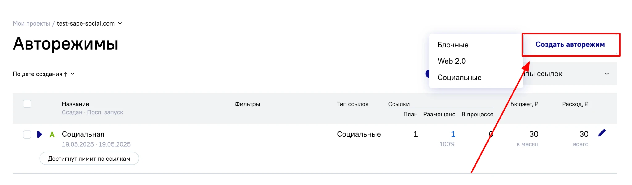 Закупку Web 2.0 ссылок также можно запустить через раздел «Автоматизация». После нажатия кнопки «Создать авторежим» откроется форма его настройки: