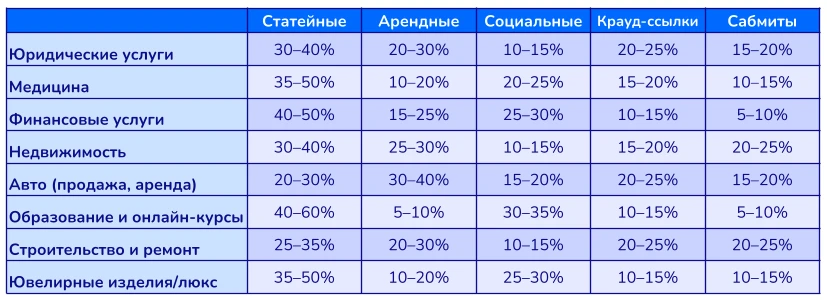 Распределение типов ссылок в разных нишах не случайно — оно формируется под влиянием особенностей пользовательского поведения, ограничений продвижения и каналов, в которых целевая аудитория чаще всего взаимодействует с контентом. Например, автомобильные сайты активно обсуждаются на форумах автолюбителей, а также представлены в различных каталогах, поэтому размещение ссылок на таких ресурсах будет органичным. Сайты недвижимости часто получают ссылки из каталогов агентств и форумов, где обсуждаются вопросы покупки и аренды жилья. А вот финансовые сайты получают ссылки через соцсети и СМИ — конкуренция высока, ставки за клик дорогие, а доверие критично.