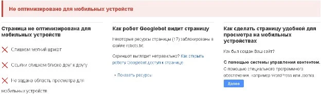 При отсутствии mobile-friendly пользователь получит информацию о наличии проблем и их краткое перечисление: