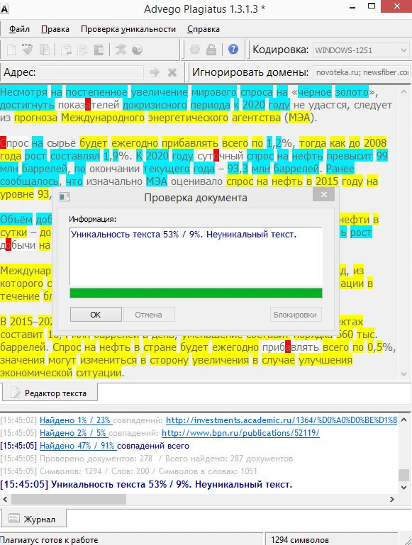 Воспользуйтесь сервисом проверки уникальности текстов — например, WebSite Auditor, Advego Plagiatus или любым другим Вам доступным, но при этом корректным. Необходимо определить уникальность всех документов на сайте. Если большая часть контента (от 20% и более) скопирована из других источников, рекомендуем принять меры по уникализации проблемных участков.