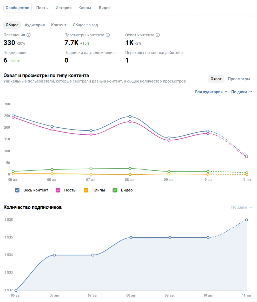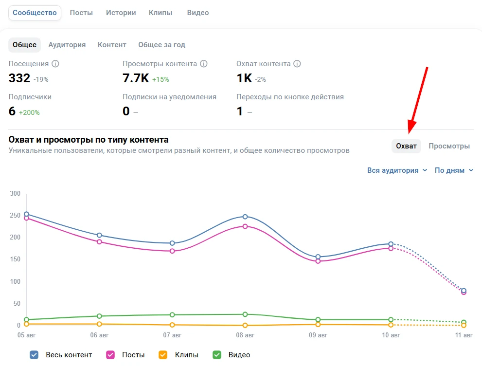 Раздел «Охват» в статистике ВК показывает, сколько уникальных пользователей увидели ваши публикации за выбранный период. Здесь важно смотреть: