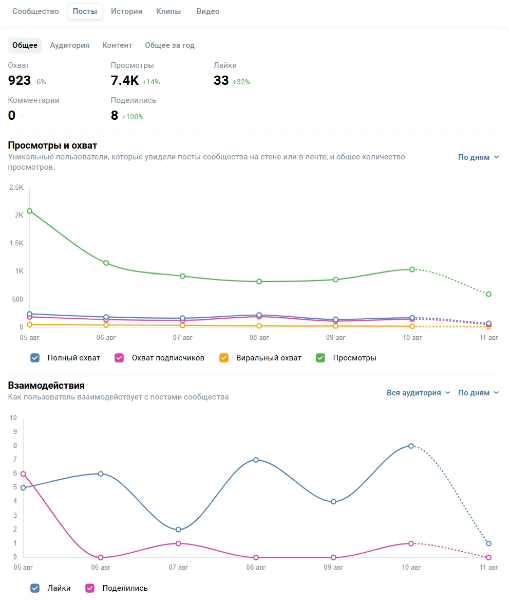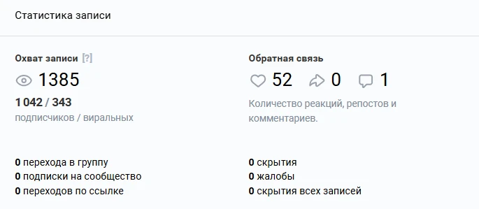 Также можно оценить эффективность рекламных записей и показатели вовлеченности по каждому типу охвата. Это помогает понять, насколько хорошо распространяется контент, интересный ли он и попадает ли в вашу ЦА.