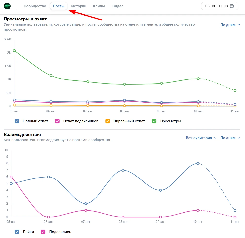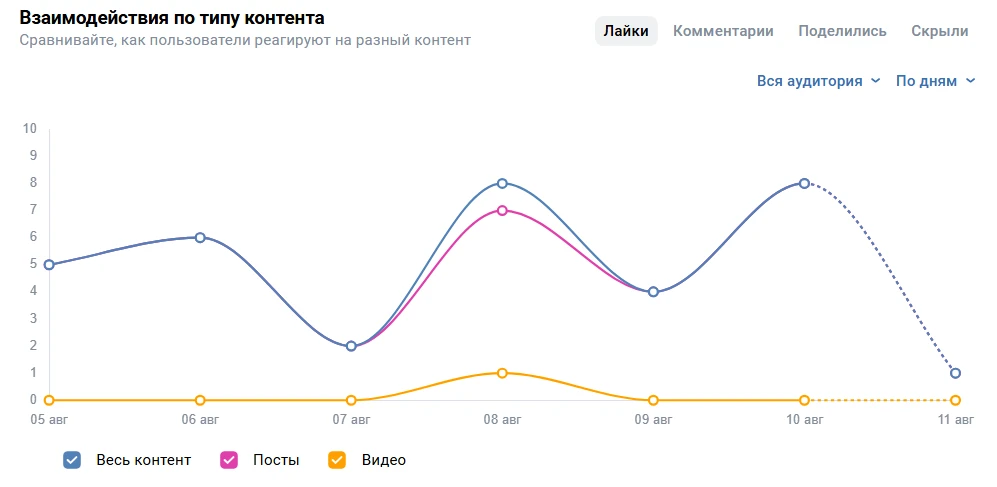 Также отображается динамика вовлеченности аудитории по дням или неделям. Эта статистика позволяет понять, в какие периоды контент вызывает наибольший отклик.
