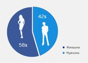 Кто же скрывается за сухими цифрами статистики? С начала 2016 года в Facebook наблюдается тенденция увеличения числа представительниц прекрасного пола среди активной аудитории. Соотношение полов выглядит следующим образом: 42 % — мужчины, 58 % — женщины.