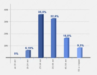 Возрастное распределение — еще одна особенность российской аудитории этой социальной сети. Здесь лидируют сразу две группы: от 25 до 34 лет — 35,3 %, от 35 до 44 лет — 32,6 %. При этом количество пользователей моложе 24 лет минимально — всего 6,1 %. Зато почти в 4 раза больше активных пользователей из числа тех, кому уже за 45.
