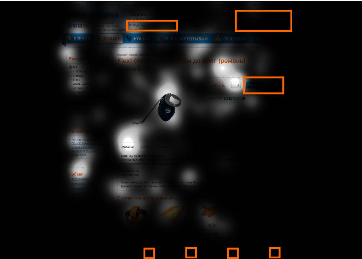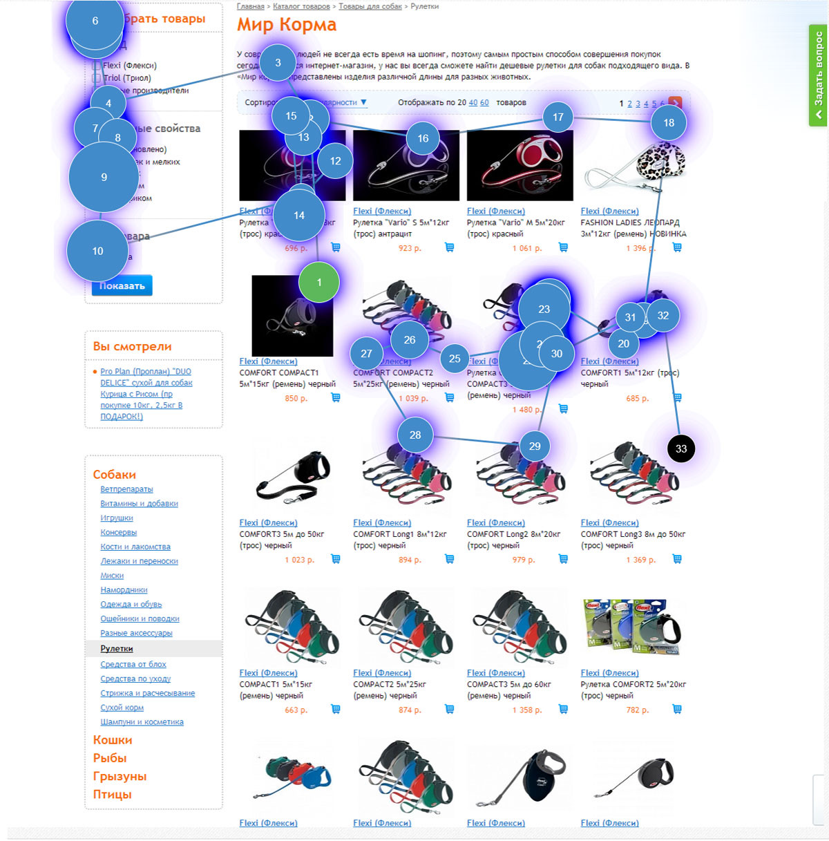 При анализе поведения пользователей, было выяснено, что многие из них уходят со страницы каталога. Понять причину помогло eyetracker-исследование, результат которого представлен на рисунке.