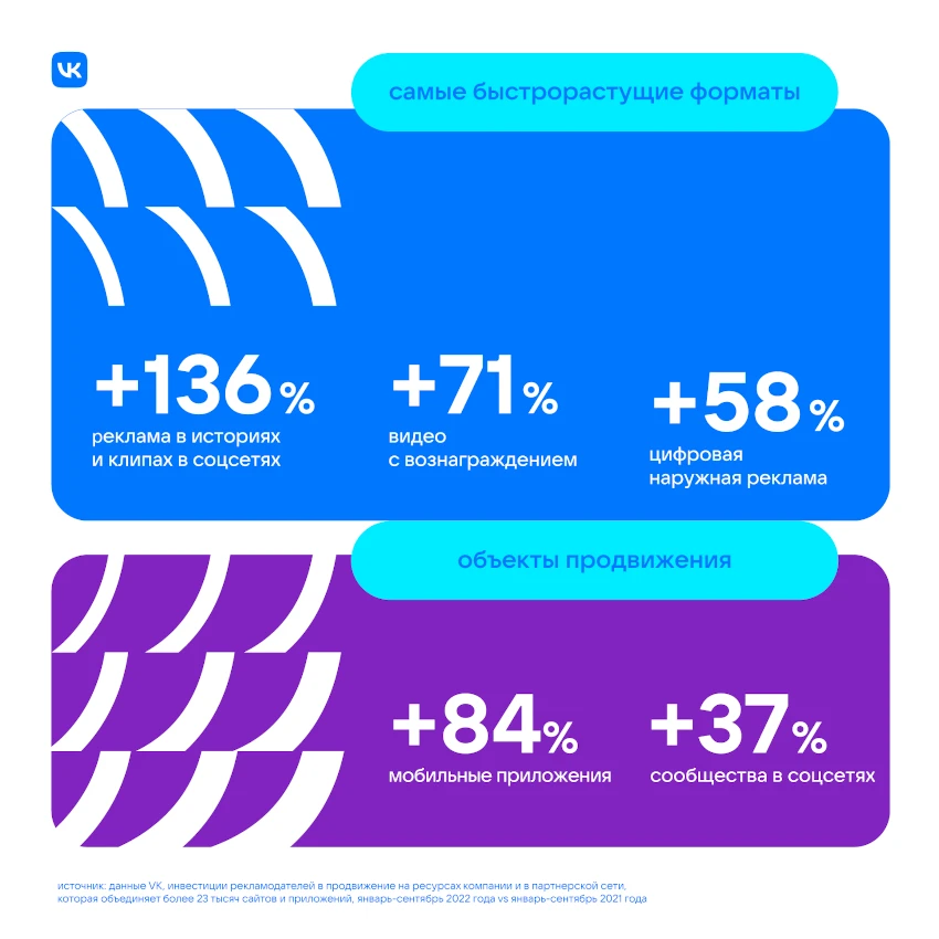 Этот тренд прослеживается и в гибридных инструментах. К примеру, myTarget расширил свое предложение цифровых дашбордов в 2022 году, добавив 400 конструкций в 11 городах, а VK сообщает, что использование их цифровой рекламы выросло на 58 % за этот же период.