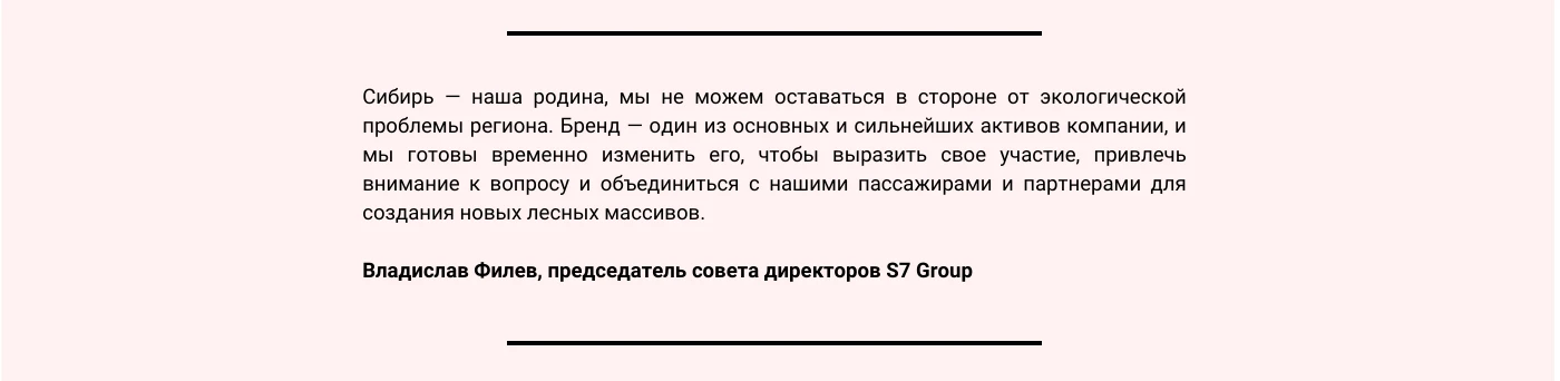 Не менее показательным был временный ребрендинг S7 в 2019 году. Когда, чтобы привлечь внимание общественности и властей к проблеме лесных пожаров на Дальнем Востоке, компания вернула себе старое название «Сибирь».