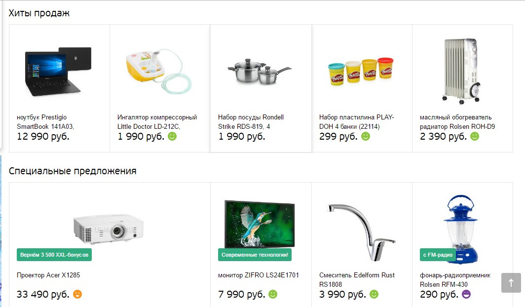 Если это интернет-магазин, рекомендуем оформить на главной странице небольшой каталог с наиболее популярными товарами, скидками и/или новинками. Если это информационный портал, то это могут быть ссылки на наиболее популярные статьи, последние материалы и т. п. Например: