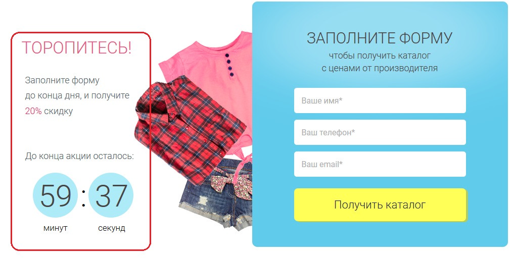 Посетитель должен понимать, почему ему необходимо купить товар именно на этом сайте. Преимущества компании, выгоды для клиента должны быть оформлены лаконично и размещены в видимой части экрана. Например, как на рисунке ниже. Выделенный блок является уникальным предложением, а ограничение акции по времени подталкивает пользователей к быстрому принятию решения.