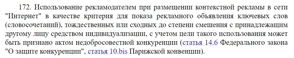 Иными словами, с момента публикации Постановления любую компанию, которая будет рекламироваться в поисковиках по запросам, похожим или полностью совпадающим с названиями конкурентов, могут оштрафовать на сумму от 100 до 500 тыс. рублей по ст. 14.33 КоАП РФ.