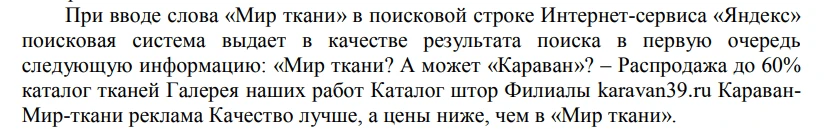 Один из способов — это «честное» использование бренда конкурентов в тексте объявления. Например, в деле №А21-16284/2019 суд встал на сторону ответчика. Истец обвинил компанию в неправомерном использовании торговой марки «Мир ткани» в своем объявлении.