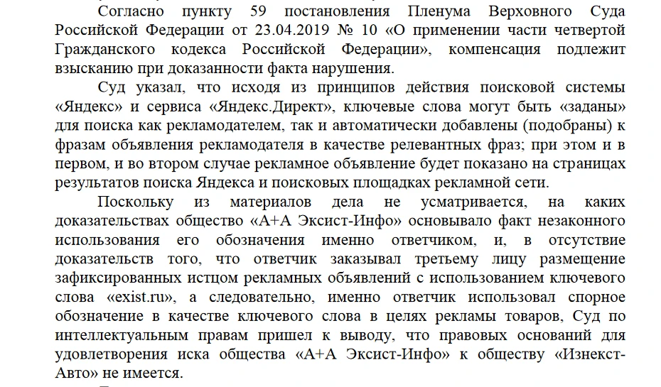 Стоит отметить, что Постановление Пленума Верховного суда — это не что-то совершенно новое. Скорее, оно стало логичным следствием уже существующей судебной практики. Так, одно из первых решений по аналогичному делу А28-10965/2016 было вынесено в 2016 году. Тогда суд встал на сторону истца и взыскал с компании-нарушителя 513 тыс. рублей. Дело примечательно еще и тем, что это был первый случай, когда нарушением было признано использование чужого товарного знака не только в заголовках и текстах объявлений, но и в ключевых словах.