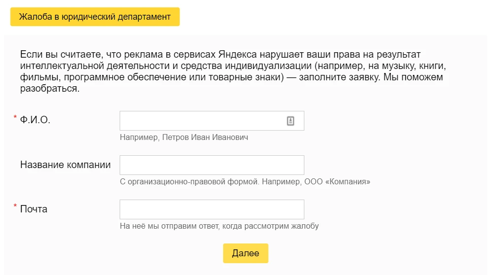 Для подачи жалобы используйте специальную форму, доступную по ссылке. К жалобе необходимо приложить документы, которые подтвердят ваши права на интеллектуальную собственность, а также скан письменной жалобы с подписью или с подписью и печатью.