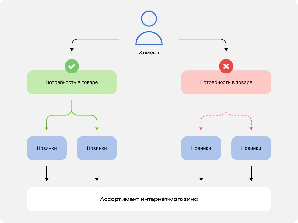 Как устроена подборка. То, что клиент однажды оформил заказ в определённом магазине, не значит, что он вернётся в него снова. Даже планируя покупку, человек может случайно наткнуться на товар на маркетплейсе, в магазине у дома или на «Авито» — и приобрести там.