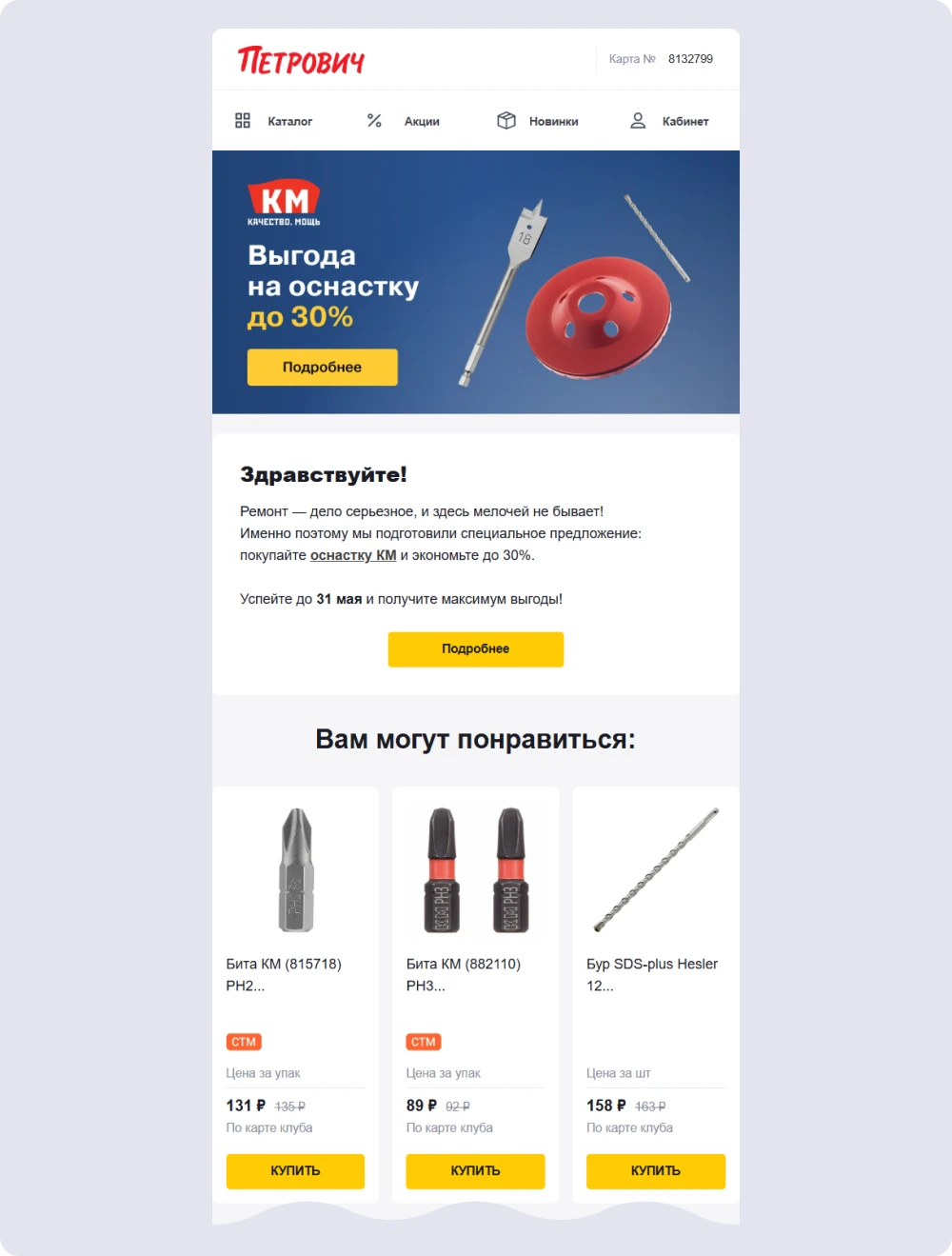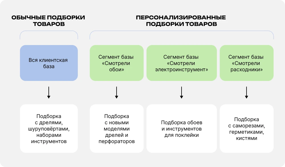 Вот пример. Строительный магазин запускает рассылку с популярными товарами — дрелями, шуруповёртами и наборами инструментов — по базе подписчиков. Но такие подборки интересны не всем: