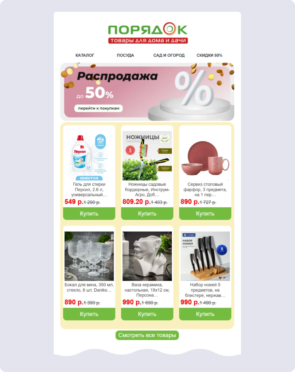 Также товары повседневного спроса приносят бизнесу стабильный оборот — их покупают часто и без долгих раздумий. Если напоминать о них через письма, добавив акцию или бонус, можно стимулировать клиентов на повторные заказы. В итоге магазин не только удержит покупателей, но и получит предсказуемый поток продаж.