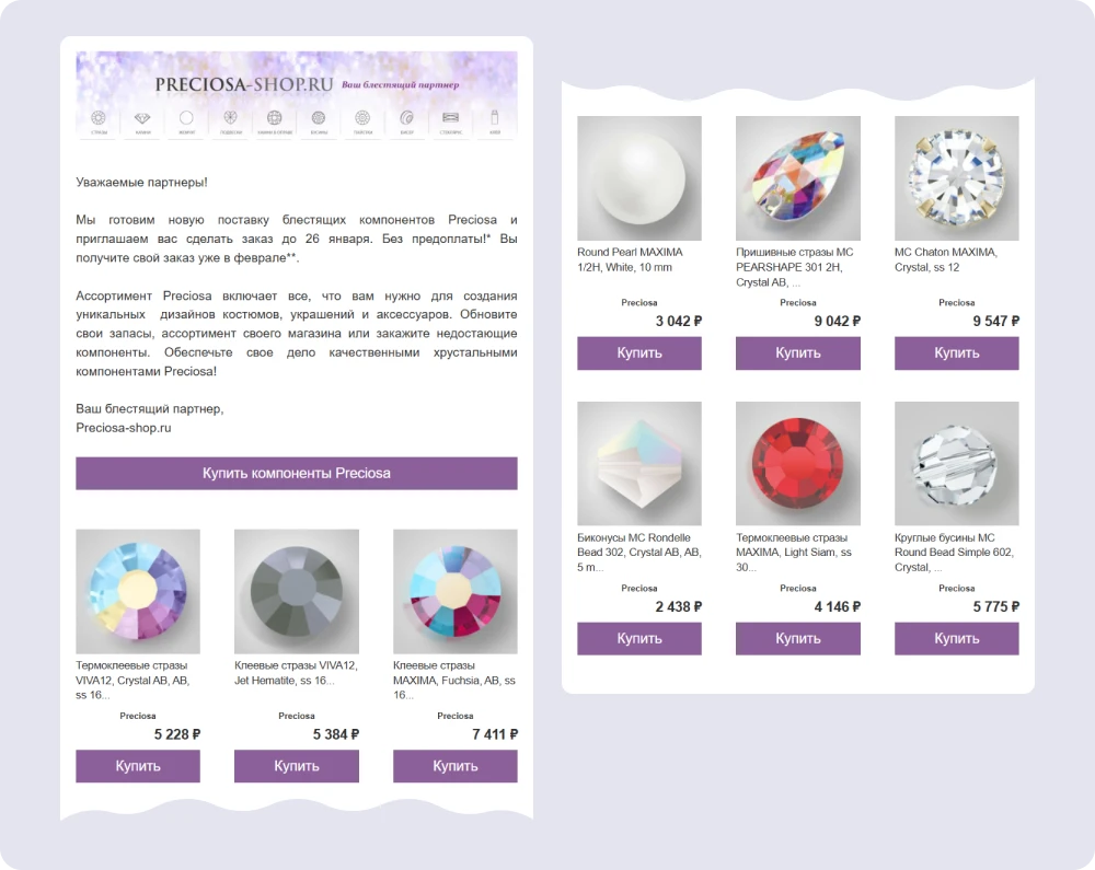 Подборка удерживает клиентов. Письмо с персональной скидкой на любимые товары создаёт впечатление удачного момента для траты денег. В результате пользователь оформляет заказ сразу, пока выгодно. Магазин не теряет постоянных покупателей и стимулирует повторные продажи без дополнительных затрат на рекламу.