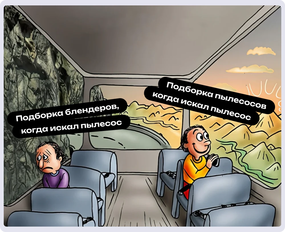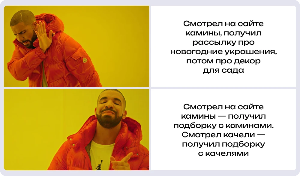 Например, человек просматривал на сайте пылесосы, а получает письма с блендерами — тема неактуальна, письмо улетает в корзину. Зато подборка с моделями пылесосов или аксессуарами работает как шпаргалка — помогает быстрее выбрать подходящую технику.