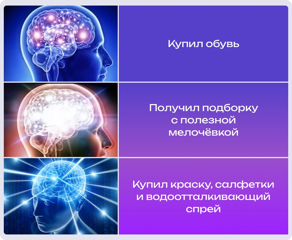 Подборки сопутствующих товаров помогают купить всё нужное сразу. Например, человек выбирает обувь — в рекомендациях видит краску, салфетки и водоотталкивающий спрей. В итоге покупателю удобно: не забудет ничего важного. Бизнесу выгодно: сумма заказа увеличивается.