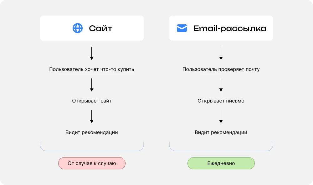 Когда полезны подборки на сайте. Пользователь заходит на сайт, когда у него уже сформирована потребность что-то приобрести. Поэтому увидеть персональную товарную подборку он сможет только, когда сайт открыт. Если потребности нет, человек не откроет сайт — а значит, и рекомендации не увидит.