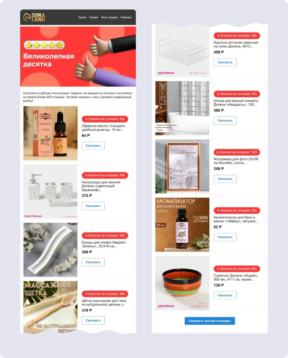 Подборки с бестселлерами ускоряют решение о покупке. Клиенту не нужно искать отзывы или смотреть обзоры — он получает список товаров, за который другие покупатели проголосовали рублём.