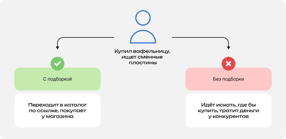 Как устроена подборка. Клиент планировал взять один товар, но покупает больше, выбирая что-то из предложенной подборки. В результате магазин увеличивает и средний чек, и выручку.
