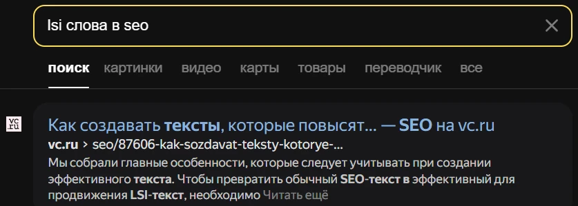 Добавлять LSI ключи. Это слова и словосочетания, которые связаны по смыслу с продвигаемыми запросами, но не входят в них. Иногда их можно найти по подсказкам поисковых систем — такие слова подсвечиваются жирным шрифтом в сниппетах. Например, на тему LSI ключей это слово «текст».