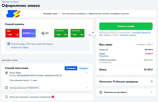 Выбор способов доставки и оплаты при оформлении заказа на сайте маркетплейса Ozon