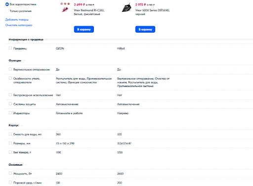 Таблица сравнения утюгов на сайте маркетплейса Ozon — удобно и наглядно