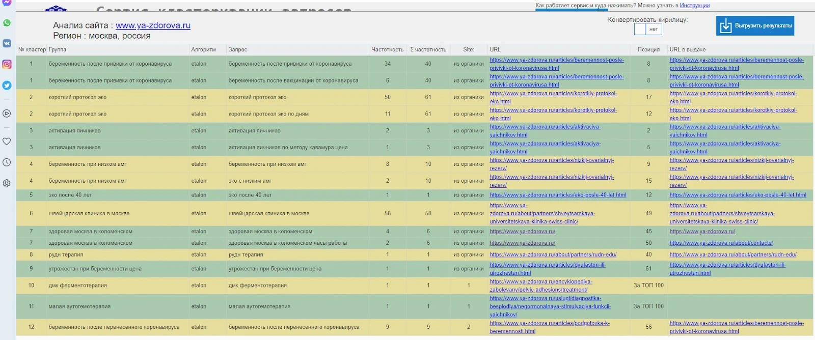 Пример работы внутреннего сервиса Demis Group «Кластеризатор», который помогает правильно распределять запросы по страницам