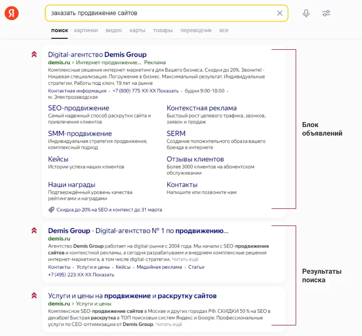 Контекст, бесспорно, самый быстрый и эффективный способ для привлечения горячих целевых посетителей. Ведь рекламное объявление не только показывается людям, которые уже интересуются продуктом или услугой, но и выводится самым первым, на 3–4 пункта выше начала органической выдачи.
