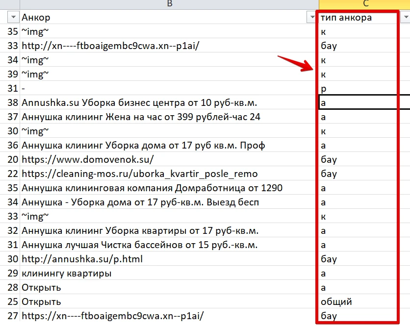 Далее важно правильно составить анкор-лист. Выгрузите ссылки конкурентов в таблицу и отметьте все типы анкоров, которые используются в профиле — укажите, какой процент приходится на анкорные, а какой — на безанкорные ссылки: