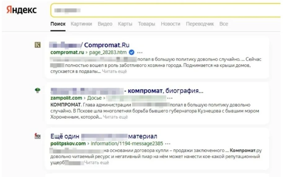 Пример: поисковая выдача по персональному запросу о владельце компании. На верхних строчках — сайты с компроматом. Очерняющая информация, связанная с политическим прошлым, может вызвать недоверие потенциальных партнеров, инвесторов, работодателей, подчиненных, подрядчиков, журналистов. Это риск для репутации и персоны, и компании.