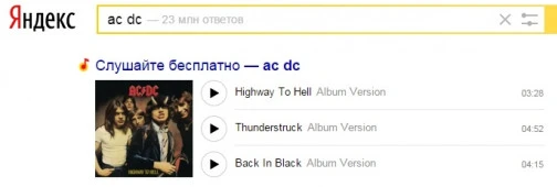Музыка. Если пользователь вводит запрос, который идентифицируется как музыкальный, то в результатах поиска выводится плеер. В нём отображается несколько композиций соответствующего исполнителя и ссылка на Яндекс.Музыку, где можно ознакомиться с творчеством артиста более подробно.
