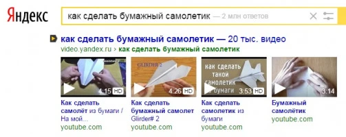Видео. Появляется в случае, если запрос подразумевает просмотр чего-либо, например «как сделать бумажный самолетик». А ещё это незаменимый сервис для тех, кто не помнит, как точно назывался тот или иной ролик — пользователю предлагаются видеозаписи, максимально соответствующие его запросу, остаётся только выбрать.