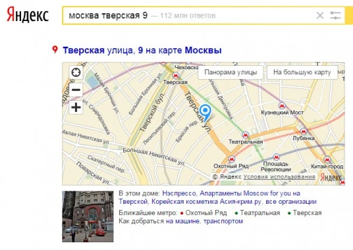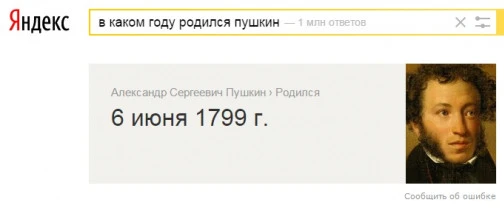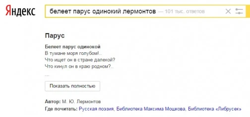 Стихи. Если запрос представляет строку из какого-либо стихотворения, то перед поисковой выдачей будет выводиться искомое четверостишие и ссылка на страницу, где можно прочесть произведение целиком.
