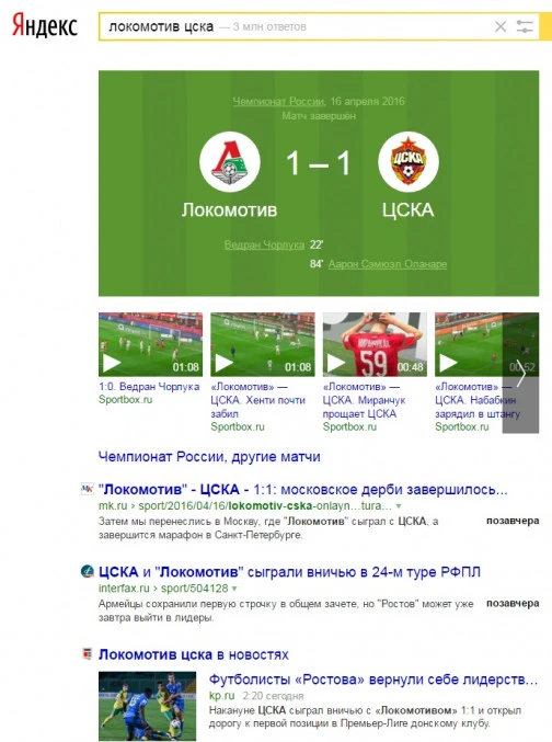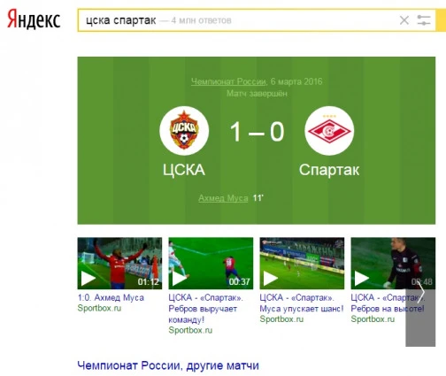 Спортивные результаты. Этот колдунщик показывает информацию о последних на данный момент результатах матчей между указанными клубами, а также даёт ссылки на видеозаписи с обзорами.