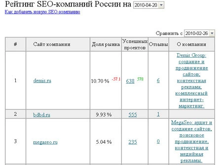 Итоги обоих рейтингов не случайны. Они свидетельствуют о перестановке сил на рынке поисковой оптимизации и раскрутки сайтов. В кризисный 2009-й год (и в начале 2010-го года) на SEO-рынке произошли существенные изменения. Многие компании, попавшие в финансовую зависимость от кредиторов из-за непродуманной политики внешних заимствований, прекратили свое существование. Другие были поглощены более крупными игроками, которые смогли увеличить свою долю рынка за счет выгодных слияний или потерь со стороны конкурентов. Свою негативную роль сыграла и нестабильность ведущей поисковой системы России (Яндекс), которая в последнее время участила смену поисковых алгоритмов ранжирования сайтов. Это привело многих корпоративных оптимизаторов на грань разорения, так как теперь лишь немногие игроки рынка могут гарантировать успешное продвижение сайтов в топы поисковых систем. В плюсе, т.е. в наиболее выгодном и стабильном положении, оказались те компании, которые выбрали агрессивную маркетинговую стратегию и грамотную финансовую политику (собственных больших инвестиционных вливаний), вышли на SEO-рынок с уникальными акционными предложениями, сумели сохранить и нарастить свой интеллектуальный (кадры) и инновационный (технологии) потенциал - все это дало свои плоды. Темпы роста некоторых SEO-компаний в кризисный 2009-й год впечатляют - 50-60% и более. Речь идет о таких показателях, как: доля рынка оптимизации и продвижения сайтов, объемы продаж (в руб.), общее количество и средний денежных вес активных SEO-проектов.