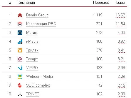 Компания Demis Group вышла на первое место в онлайн-рейтинге SEO-компаний России, подготовленном авторитетным интернет-порталом "КтоПродвинул.ру". В этом известном специализированном SEO-рейтинге традиционно принимают участие практически все крупные российские компании, студии и агентства по продвижению и поисковой оптимизации сайтов (всего - более 230 корпоративных оптимизаторов). Рейтинг составляется на основании расчета совокупной эффективной стоимости продвижения всех результативных клиентских сайтов.