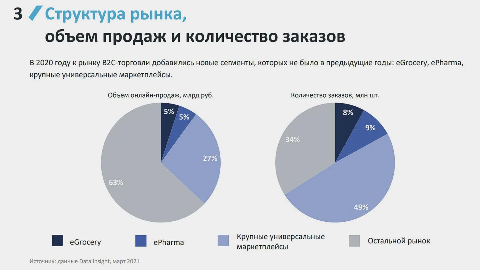 По данным Data Insight, уже в 2020 году на маркетплейсы приходилось около 30 % оборота онлайн-продаж и 49 % всех покупок в интернете. Фактически интернет-магазины постепенно вытесняются.