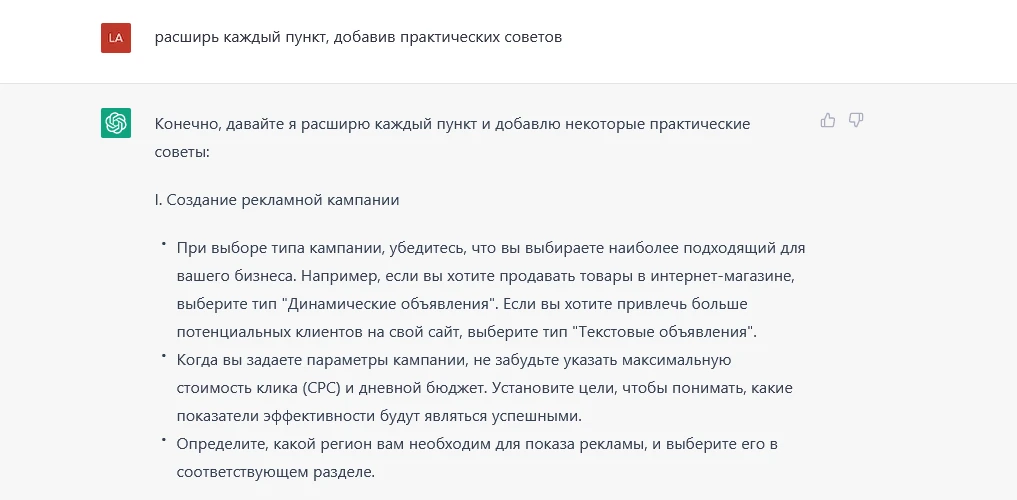 Но тут ИИ меня немного подвел. На просьбу «расширь каждый пункт, добавив практических советов», он просто написал советы для каждого пункта. Ну ничего, мы не гордые.
