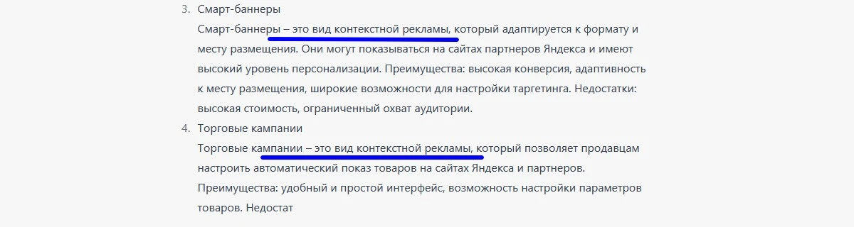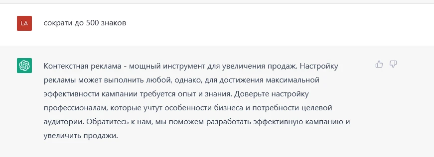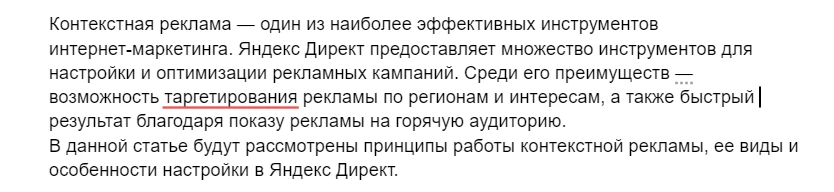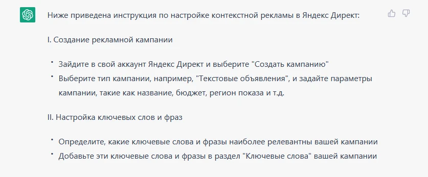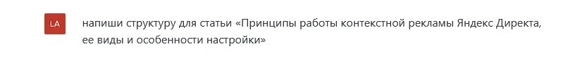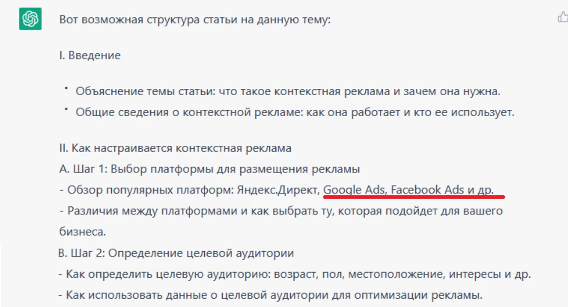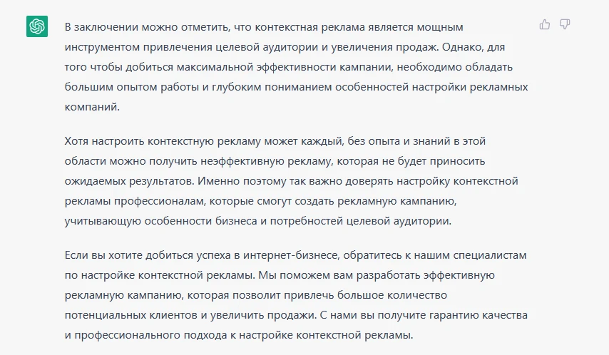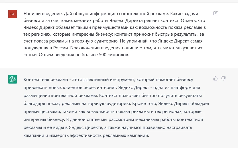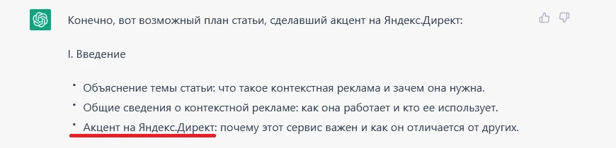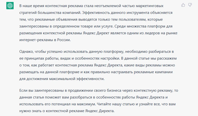 Простим ему явное перепечатывание моего запроса «Акцент на Яндекс.Директ», но вот заключение явно получилось плохо. Так как статья в целом будет рассказывать только про Яндекс.Директ, нет смысла в сравнении. ChatGPT это умозаключить не смог.