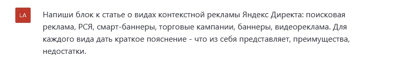 Задание для ChatGPT по написанию раздела «Виды контекстной рекламы в Яндекс Директе»: