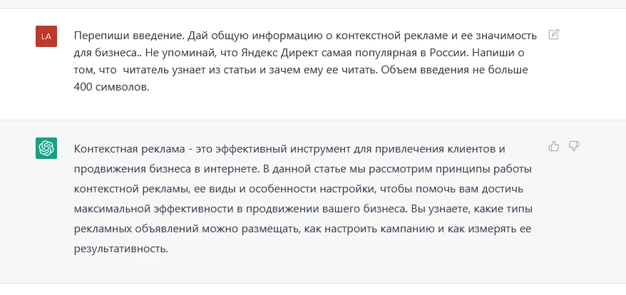 Как видите, я подробно расписала, что именно хочу увидеть в тексте. И хоть результат получился корявым, его уже можно использовать. В итоге я сама переписала введение, оставив от оригинала только первое и последнее предложение.