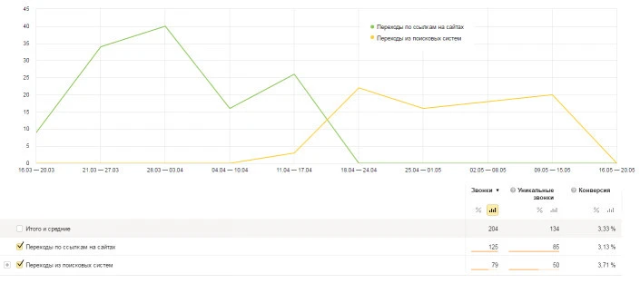 Выше приведена динамика по звонкам со следующих источников: «Поисковые системы» и «Внешние ссылки». Можно сделать вывод, что настройка услуги «Целевой звонок» позволяет отследить количество звонков с сайта в зависимости от вида трафика.