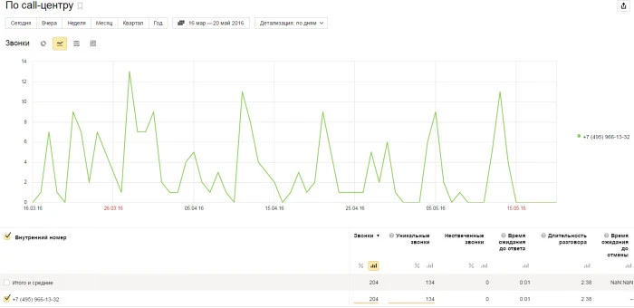 Можно отследить объем звонков, поступивших на входящий номер, и оценить уровень загрузки Вашего персонала.