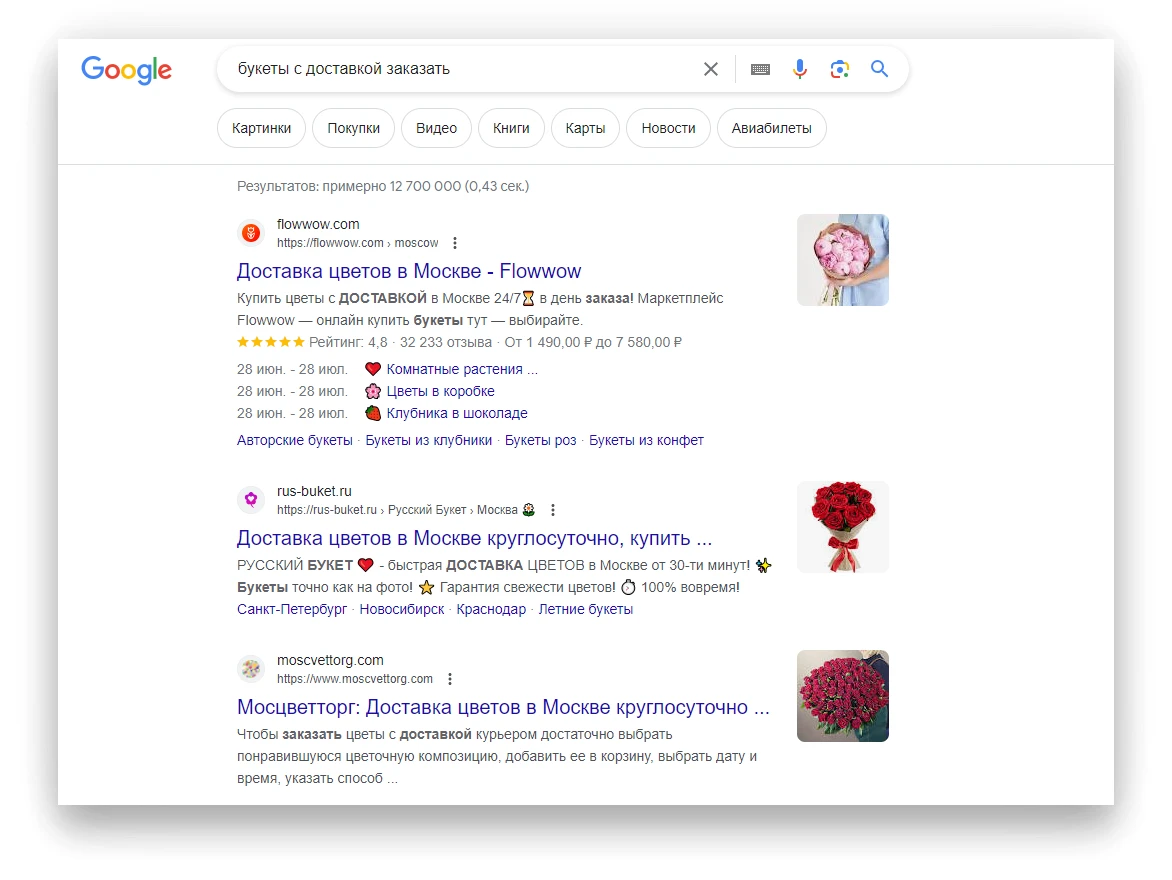 Например, система Google выдает более 12 миллионов результатов по запросу о доставке цветов. Большинство пользователей будут заходить на сайты с первой страницы выдачи, поэтому важно, чтобы компания была в топе